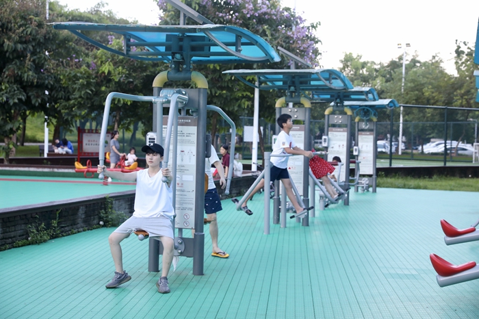 在西溪親水公園柳舒園段的智慧體育公園里,不少市民在空閑時前來鍛煉。健身器材邊的智能系統可實時顯示時間、次數和卡路里消耗量。 嚴潔 攝