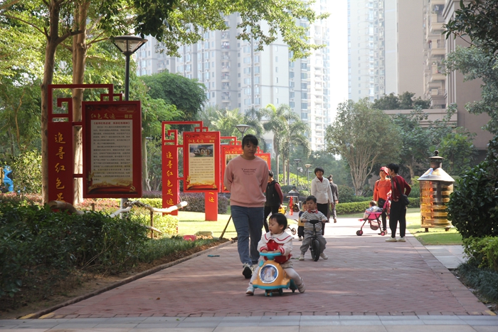 愉景灣小區(qū)沿小區(qū)休閑漫道設(shè)置紅色走廊,讓紅色文化融入日常生活