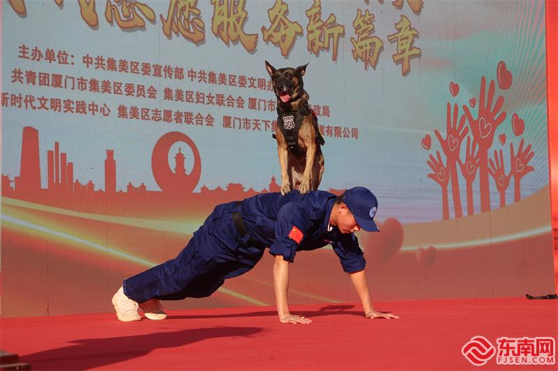 站立、翻滾、跟隨……舞臺上,集美區飛鷹義務救援隊隊員們攜救援犬、治療犬帶來節目《十里長堤汪汪護衛隊》,精彩的表演贏得了現場陣陣歡呼。飛鷹義務救援隊隊長劉曉鐘告訴記者,一直以來,這支隊伍在十里長堤等海岸開展日常巡護,今年,隊伍引入救援犬、治療犬,將再次延伸服務范圍,提升志愿服務水平。