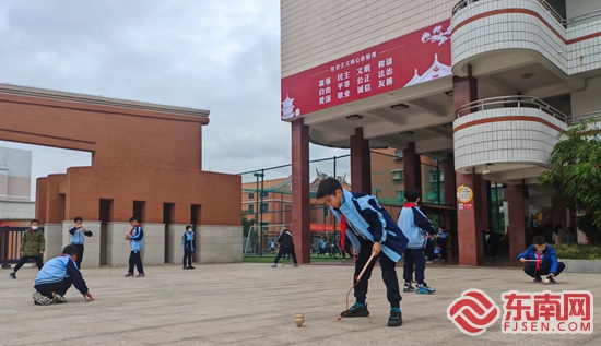 原來,為了豐富學(xué)生們的課間生活,該校推出了“你好,10分鐘”?!岸靵砼R,不少‘小懶蟲’們課間都‘窩’在教室里,不愿去操場動一動。于是,我們從學(xué)生們的興趣入手,充分利用操場、走廊等空間,并添置一批器材,把閩南童玩引入校園,讓每個學(xué)生參與其中,盡情享受課間10分鐘的快樂時光?!睂W(xué)校校長曾鳳蓉介紹道。