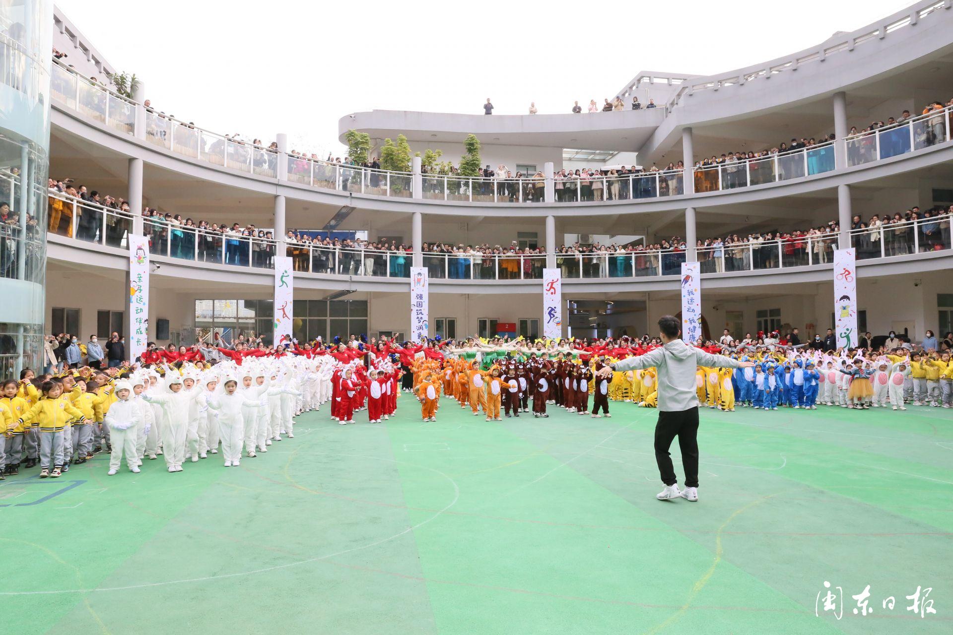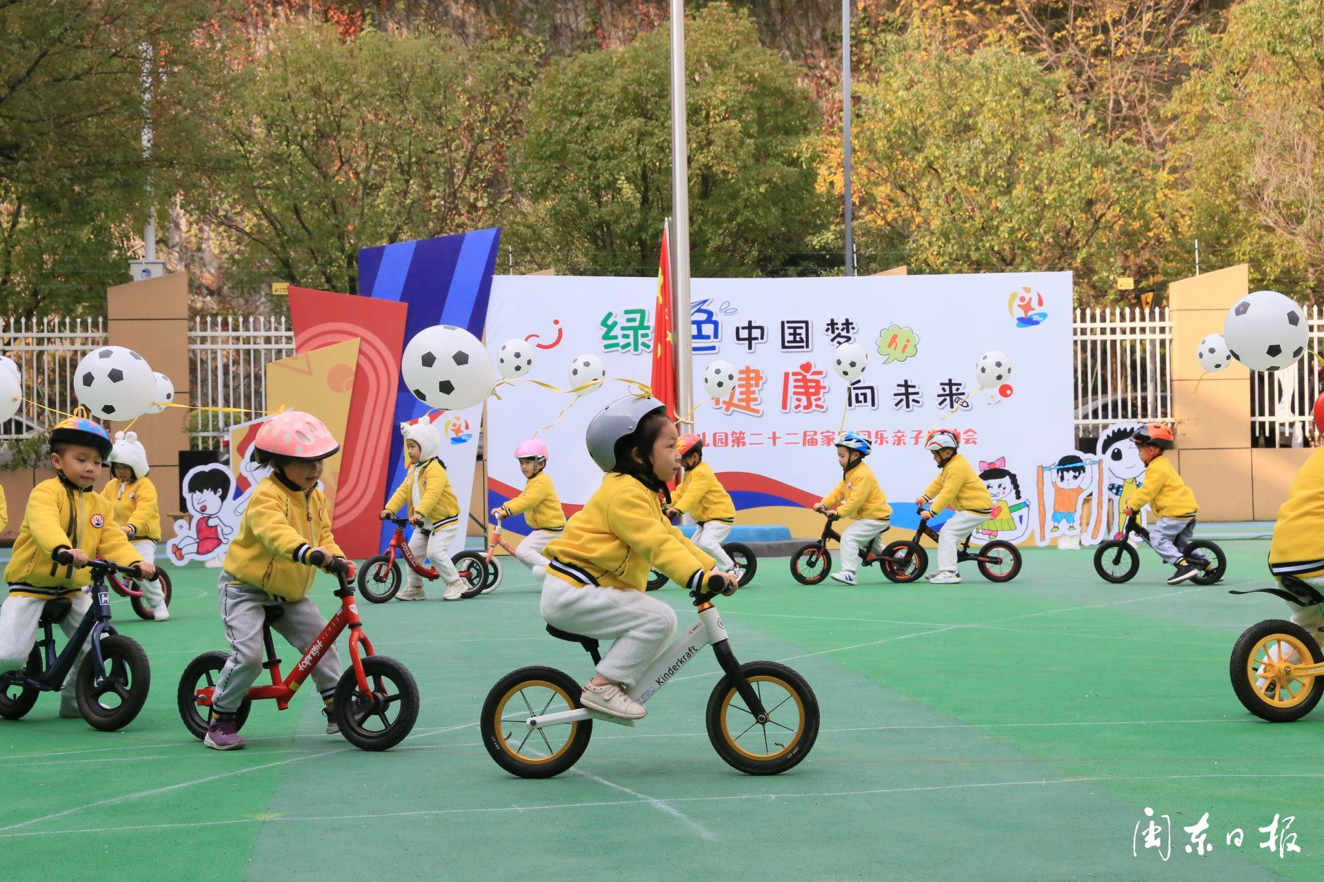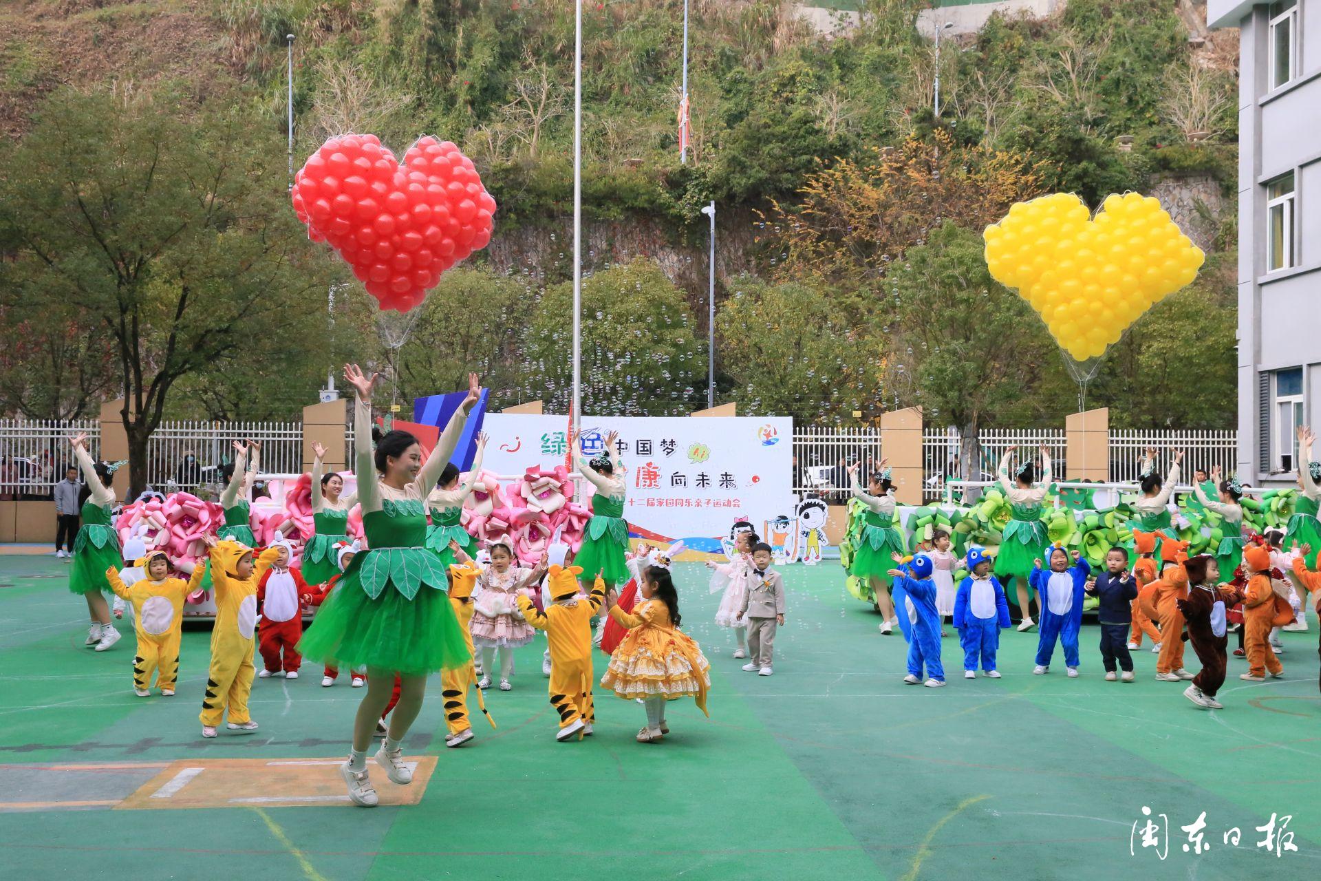 孩子們打扮成可愛的小兔子、憨憨的小老虎、呆萌的小企鵝……打著象征森林的綠傘、披著象征大海的藍色雨披,雄赳赳、氣昂昂地走進運動場。暖陽下,一場以“綠色中國夢,健康向未來”為主題的親子運動會正在舉行。