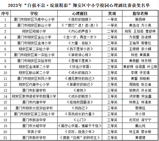 伴隨著專家評審打分及線上投票的落幕,本次中小學(xué)校園心理劇大賽結(jié)果出爐,最終,翔安區(qū)馬巷中心小學(xué)《隱形的翅膀》、舫山小學(xué)《“擺爛”退!退!退!》獲得一等獎,還有6所中小學(xué)的作品獲得二等獎、13所中小學(xué)的作品獲得三等獎。