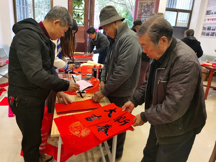 一筆一墨彰顯書法魅力,一紙一硯譜寫美好愿景。在文化惠民志愿服務活動現場,村民們圍攏在書案前,挑選自己喜愛的聯句請書法家書寫。“玉地祥光開泰運,金門旭日耀陽春”“吉星照地全家福,鴻運當頭萬事通”……仙游縣書法家協會志愿者們鋪展紅紙,凝神聚氣,揮毫潑墨。古韻盎然的隸書、端莊典雅的正書、流動俊秀的行書,一幅幅平安和諧、吉祥如意的春聯和大紅的福字躍然紙上。桌上、地上、墻上,鋪滿了春聯和“?!弊?,活動現場洋溢出別樣的喜慶,淡淡的墨香伴著濃濃的祝福,為蘭石村民送上龍年的祝福。