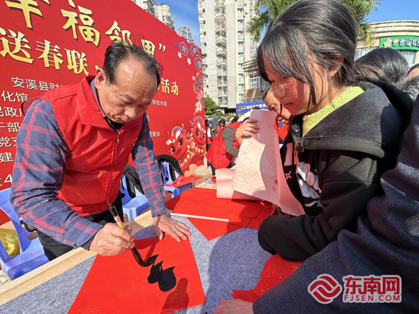 鋪紙、蘸墨、起筆……紅紙翻飛間一幅幅遒勁有力清爽灑脫的新春祝福躍然紙上。臨近春節,安溪縣各個老黨員服務站從室內走向室外,啟動新春限定活動,他們化身桑榆志愿服務者,一件紅色小馬甲、一支毛筆、一瓶濃墨,用簡單的裝備為群眾送上最濃的年味,在一筆一劃中讓年輕干部感知“廉”味。
