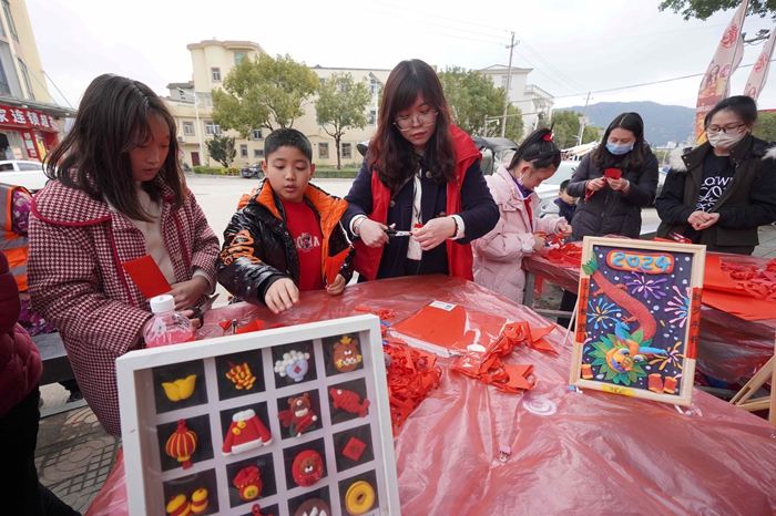 志愿者與孩子們一起剪窗花。 吳德城 攝