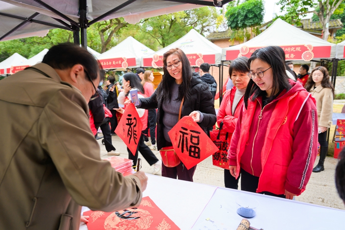 臺上表演精彩絕倫,臺下集市亦是人頭攢動。年味納福集市圍繞“探民俗”“品年味”“傳文化”主題,設置23個文明實踐志愿服務攤位。在“賞年畫 過大年”新時代文明實踐志愿服務攤位上,文化志愿者積極參與,通過寫春聯、剪窗花、賞年畫、觀非遺的有效互動,讓群眾和游客近距離感受傳統文化之美,弘揚年文化、福文化。同時,圖書漂流計劃(以書換書)、插畫速寫等攤位吸引群眾和游客駐足停留,在閱讀和繪畫中揚文明、樹新風;活動還為市民和游客提供傳統茶果、紅棗茶、八寶粥等寓意闔家團圓、和諧美滿的年貨,現場洋溢濃濃年味。