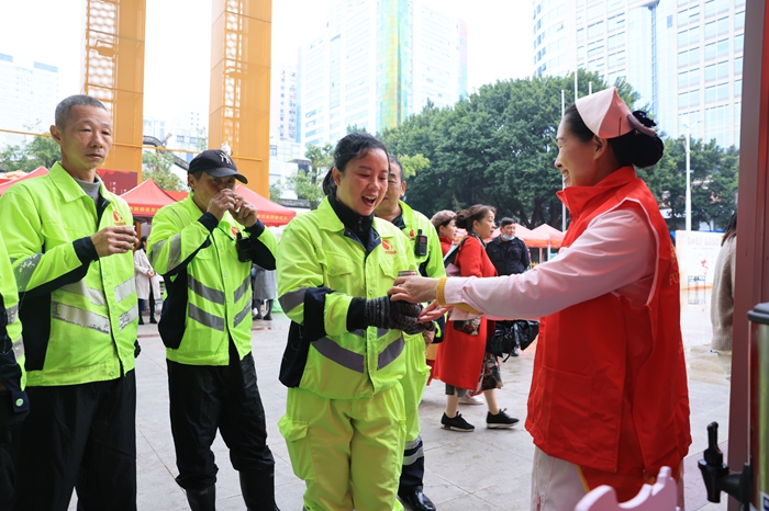 2023年鼓樓區(qū)“國際志愿者日”活動上,“鼓樓愛心茶攤”志愿者為環(huán)衛(wèi)工人遞送驅(qū)寒姜茶。(鼓樓區(qū)委文明辦供圖)