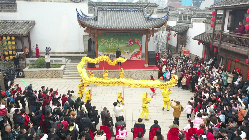 2月10日,正月初一,在建甌市鐵井欄紫芝街歷史文化街區,伴隨著歡騰激昂的鑼鼓聲,身著華麗傳統服飾的表演者們舞動著手中的金色祥龍,龍頭威武高昂,龍身靈動翻飛,吸引了眾多游客駐足觀賞。