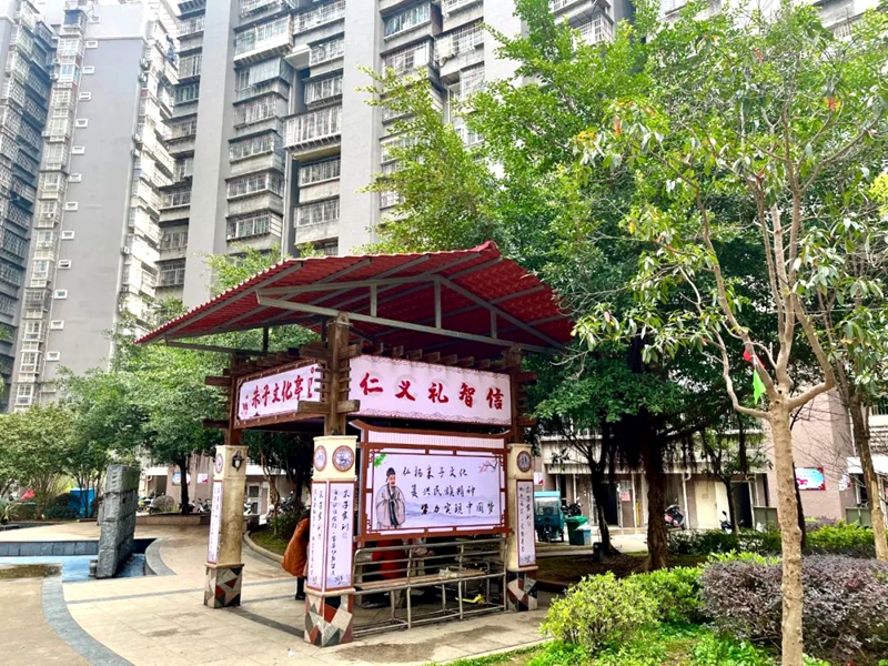 涼亭柱子上,寫著朱子家訓(xùn);涼亭一側(cè),安裝著擋風(fēng)遮陽的木板……走進(jìn)名流社區(qū),只見社區(qū)新時(shí)代文明實(shí)踐站前的“口袋公園”已是煥然一新。
