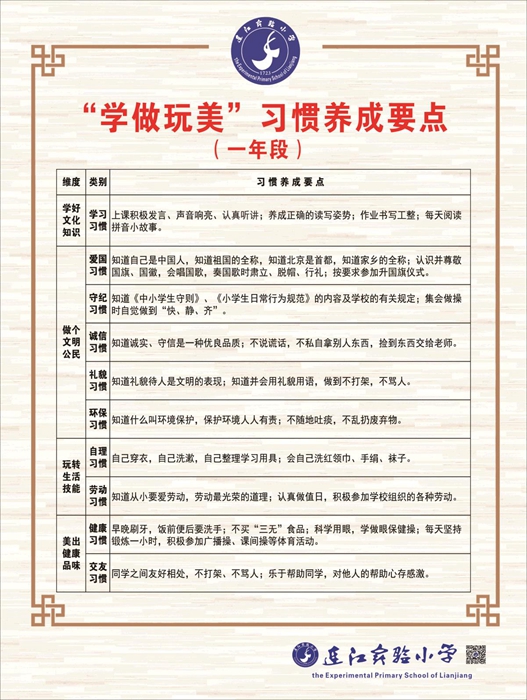 學(xué)校深入班級、家庭開展調(diào)查研究工作,結(jié)合新守則、新規(guī)范,特別考慮不同學(xué)段的學(xué)情差距,出臺《連江實(shí)小“學(xué)做玩美”習(xí)慣養(yǎng)成要點(diǎn)》、《連江實(shí)小星級學(xué)生評價(jià)管理辦法》,研發(fā)了“文明”“能力”“成長”3大類21個(gè)星座和“學(xué)習(xí)、愛國、守紀(jì)、誠信、禮貌、環(huán)保、自理、勞動(dòng)、健康、交友”十大行為習(xí)慣等養(yǎng)成教育評價(jià)要點(diǎn),將看似枯燥籠統(tǒng)的德育目標(biāo),分年級細(xì)化為可對照實(shí)踐的具象化育人標(biāo)準(zhǔn),有效體現(xiàn)年級銜接、螺旋上升,促進(jìn)學(xué)生文明養(yǎng)成。
