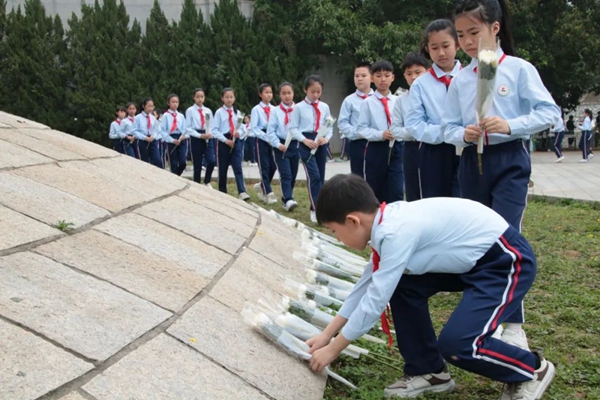 少先隊(duì)員代表面向革命烈士紀(jì)念碑誦讀《英雄贊歌》,并高唱《我們是共產(chǎn)主義接班人》,表達(dá)對(duì)英雄先烈的敬仰和繼承革命先輩光榮傳統(tǒng)的決心。