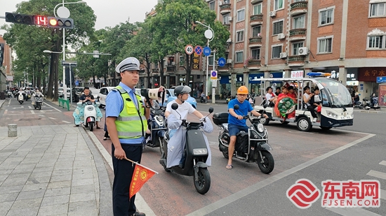鯉城交警以小喇叭喊話,提醒騎行人員佩戴安全頭盔。鯉城區委文明辦 供圖
