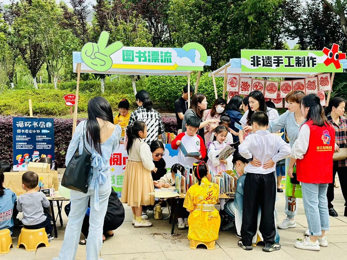 值得一提的是,本次活動還在主場區周邊布置了流動書攤區、圖書漂流區、非遺手工制作區等攤位,可以讓群眾邊逛、邊讀、邊看、邊體驗。攤位擺設井然有序,各類書籍琳瑯滿目。前來看書、購書的市民絡繹不絕,熱鬧至極。