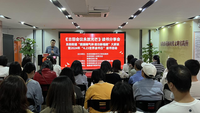 為深入學習貫徹習近平文化思想,4月18日上午,東街街道新時代文明實踐所聯合鼓樓區統計局、東街街道社區衛生服務中心舉辦《古田會議永放光芒》讀書分享會——“提振精氣神 建功新福建”大家談活動暨2024年“4·23世界讀書日”活動。分享會圍繞《古田會議永放光芒》主題內容,深入了解古田會議的歷史背景、重大事件及其精神內涵,并結合新時代福建建設,談如何傳承和發揚古田會議精神。