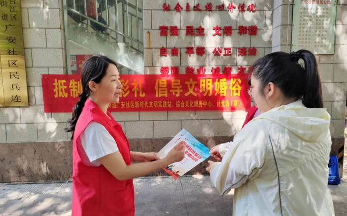 文明風5月10日訊 高額彩禮問題事關民風民生,是當前移風易俗的一個重點難點。為大力培育和踐行社會主義核心價值觀,破除高額彩禮、鋪張浪費等陳規陋習,弘揚勤儉節約、文明健康的生活方式,近日,臺江區廣泛組織開展“抵制高額彩禮,倡導文明婚俗”宣傳引導工作。