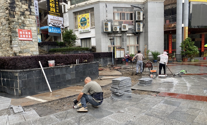 工人在更換防滑地磚 (圖片來源:水南街道江南社區)