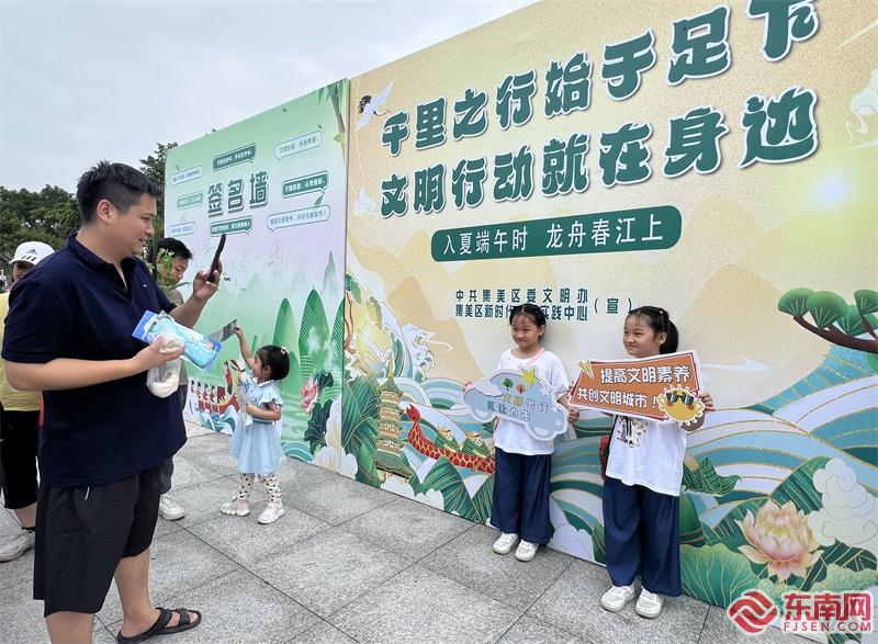 “文明出行,禮讓為先”“文明在心中,平安在手中”“創建文明城市,做文明集美人”……走進龍舟文化市集文創市集,文明主題簽名墻吸引市民游客簽名“打卡”。不少參與者還手拿文明主題手舉牌合影留念,通過社交平臺記錄文明瞬間,爭當文明風尚的傳播者、文明禮儀的倡導者。