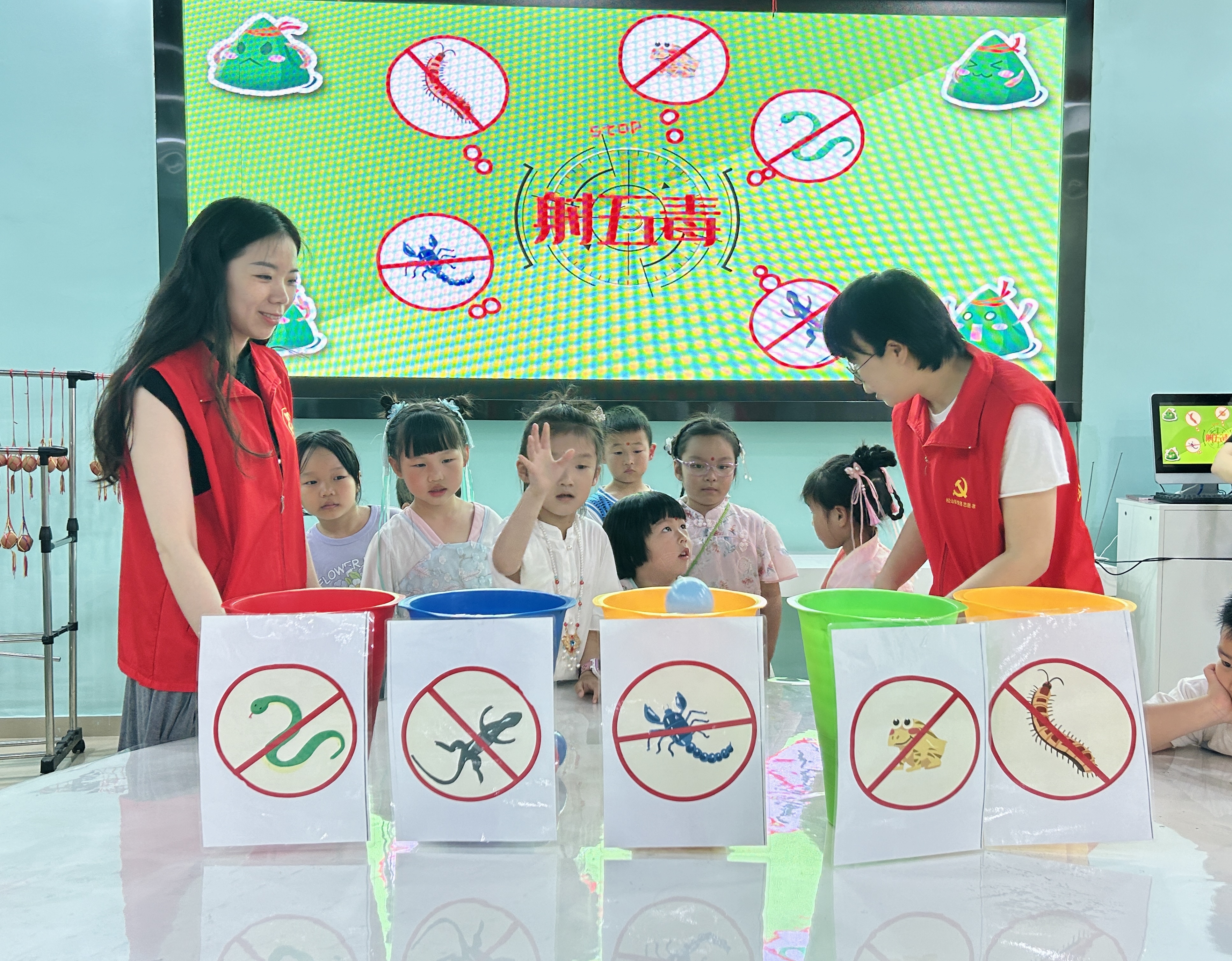 在傳統文化知識小課堂上,志愿者為居民們介紹端午節的由來及文化習俗。活動中,志愿者還邀請孩子們進行“投五毒”端午小游戲,讓孩子們加深對端午傳統習俗的認識,充分感受到中華傳統文化的魅力。