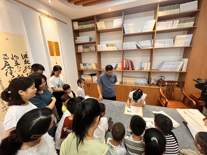 在“翰墨迎六一”的環節,南靖書法家現場示范書寫書法作品,并為孩子們進行現場指導。書法老師從基本筆畫、間架結構、章法布局等多個方面,一筆一畫地給孩子指點,孩子們認真傾聽、模仿,在書法家老師的悉心指導下,孩子們的書寫水平得到了提升,激發了孩子們對書法的興趣,提高孩子們對書法的熱愛。