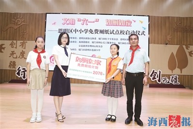 5月31日下午,“文明‘六一’如廁如家”——思明區中小學免費廁紙試點校啟動儀式,在思明區蓮前小學舉行。廈門市紅十字會副會長、廈門市紅十字基金會理事長蔡志凱,思明區政協副主席鄭尤男,海西晨報社社長、總編輯陳煒明,思明區政協提案辦主任張興,思明區教育局副局長陳華強,思明區政協文體委主任王萍,海西晨報社副總編輯易福進,捐贈方代表、章老三(福建)生物科技有限公司創始人謝龍真,捐贈方代表、濱東小學少先隊大隊部、七色花小記者站小朋友代表,以及“如廁如家”免費廁紙計劃發起人代表等參加了啟動儀式。