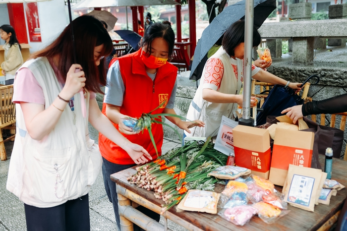 端午民俗體驗區,志愿者和社區工作人員忙準備、分發艾草、香囊等(鼓樓區委文明辦供圖)