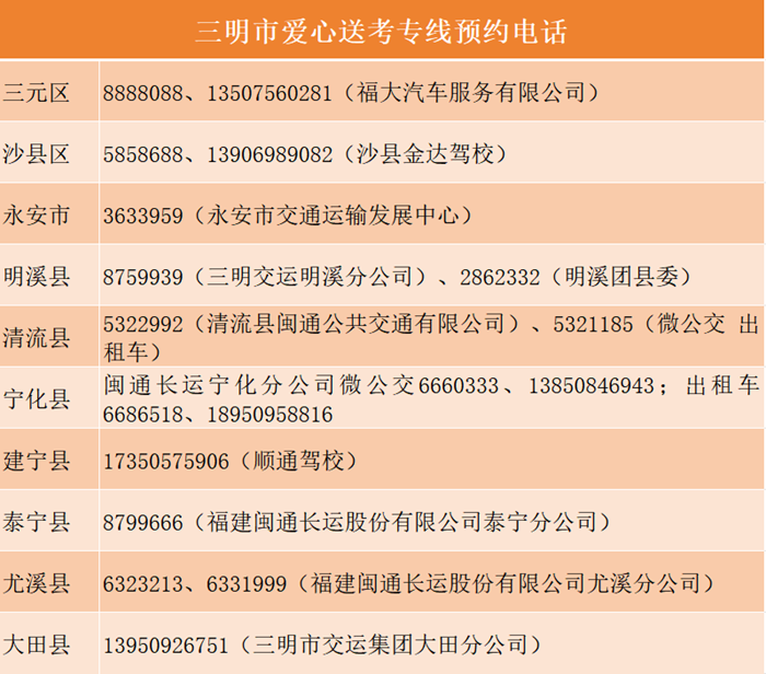 三明各縣(市、區(qū))紛紛響應,全市1000多輛愛心送考車輛已準備就緒,免費接送高考學子前往考場,助力莘莘學子圓夢。三明高考考生可撥打預約電話,預約愛心送考車輛進行點對點接送;也可以通過定點、招手等方式,免費乘坐張貼“愛心送考車”標志的送考車輛前往考場。