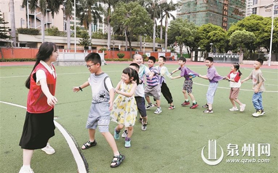 7月8日,在豐澤區(qū)第三實驗小學(xué)內(nèi),參加職工子女暑托班的孩子們在志愿者的帶領(lǐng)下進(jìn)行課間游戲。(融媒體記者張九強 攝)