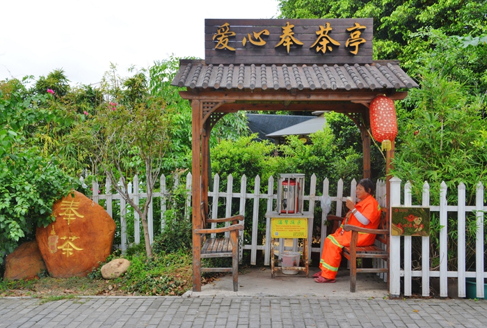 在晉江市區(qū)和平路機(jī)場對(duì)面,綠樹花叢掩映中有一座古色古香的“愛心奉茶亭”,亭內(nèi)有茶水、一次性杯子,亭子兩側(cè)設(shè)有座椅,給需要避暑歇腳的人帶來諸多便利。
