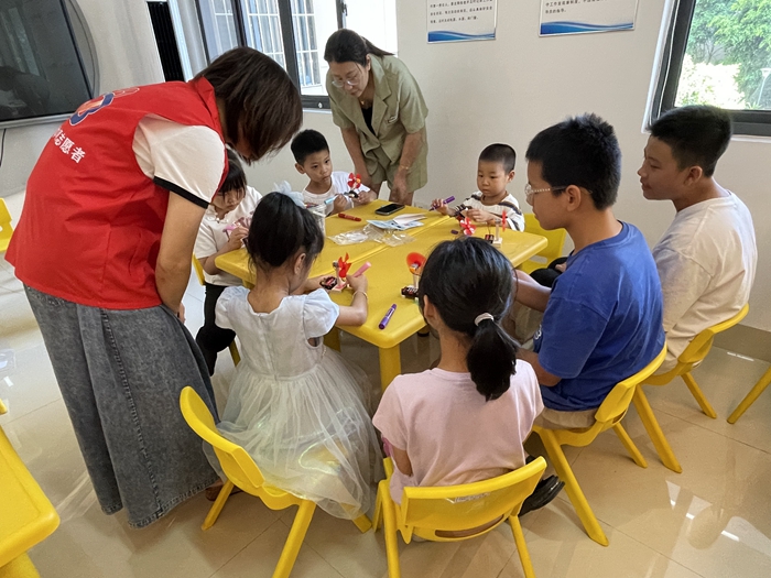 志愿者教小朋友們制作電風(fēng)扇。福州文明網(wǎng)供圖