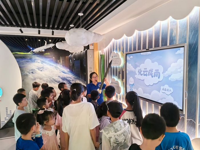 在氣象志愿者的帶領(lǐng)下,營員們參觀了氣象科普展館內(nèi)的臺站沿革、氣象之最、閩侯氣象沙盤、人工影響天氣等展區(qū),不僅學(xué)習(xí)到了人工影響天氣相關(guān)知識,還沉浸式體驗臺風(fēng)發(fā)生的過程,增強了對氣象災(zāi)害的認識,認識到了保護環(huán)境、減緩氣候變化的重要性。此外,營員們還利用現(xiàn)學(xué)到的知識進行人影互動,模擬體驗了一次人影作業(yè)的過程。