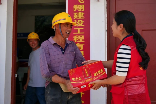 “涼茶送得很及時(shí),最近的高溫天氣給工友們都熱壞了!”在桂陽(yáng)鄉(xiāng)王春溪和黃村里溪重點(diǎn)山洪溝治理工程現(xiàn)場(chǎng),工人們收到暖心的物資紛紛感謝道。