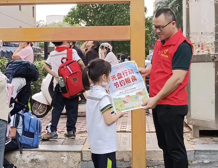 志愿者向學生宣傳“光盤行動,節(jié)約糧食”(薌城區(qū)發(fā)改局 供圖)