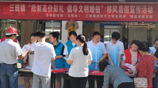 “文明新風(fēng)靠大家,你不攀比,我不浪費(fèi),省事省心又省錢。”志愿者一邊發(fā)放移風(fēng)易俗宣傳資料,一邊入戶宣講著,向大家積極倡導(dǎo)弘揚(yáng)社會(huì)主義核心價(jià)值觀,摒棄陳規(guī)陋習(xí),提倡文明、節(jié)儉、綠色的生活理念。同時(shí),還發(fā)放移風(fēng)易俗倡議書,向村民們闡釋了厚葬薄養(yǎng)、鋪張浪費(fèi)等不良習(xí)俗對社會(huì)、家庭和個(gè)人所造成的危害。今年以來,三班鎮(zhèn)已發(fā)放倡議書1000多份、宣傳頁1200余份,逐步引導(dǎo)群眾改變觀念,自覺自愿地參與到移風(fēng)易俗的行動(dòng)中來。