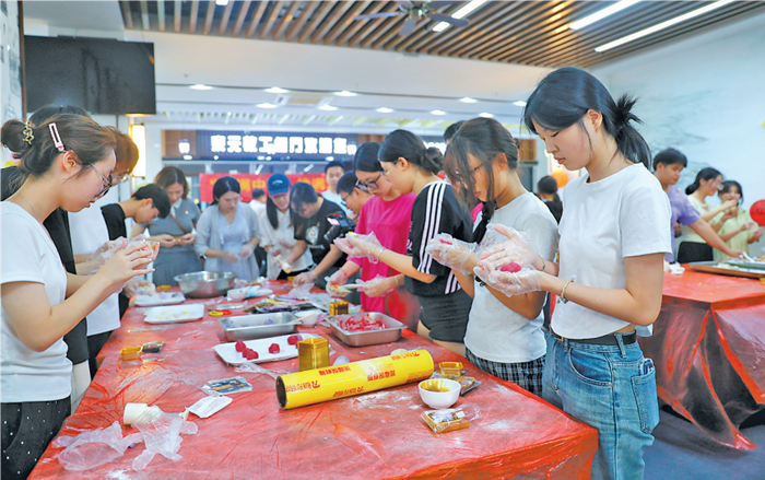 在福建信息職業(yè)技術(shù)學(xué)院平潭校區(qū),同學(xué)們一起制作月餅。