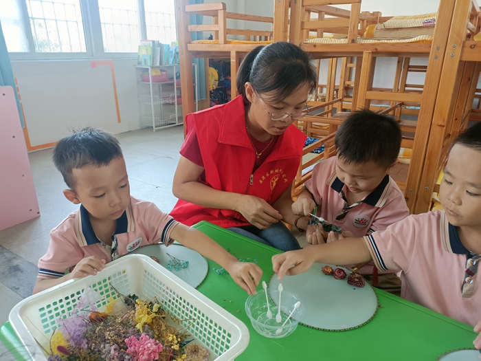 志愿者和小朋友一起制作團(tuán)扇。泉港區(qū)前黃鎮(zhèn)供圖