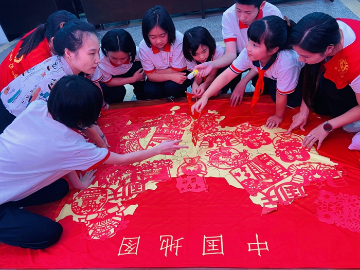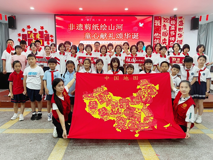 在隨后的非遺剪紙文化體驗環節,青少年們運用傳統剪紙技藝,創作出了一幅幅蘊含愛國情感的作品,并將這些作品拼接成了一張中國地圖,以獨特的方式表達對祖國大好河山的無限熱愛與深深銘記。活動在集體大合唱《我和我的祖國》嘹亮的歌聲中落下帷幕。伴隨著激昂的旋律,大家揮舞著手中的五星紅旗,共同表達對祖國的深情祝福與熱愛。