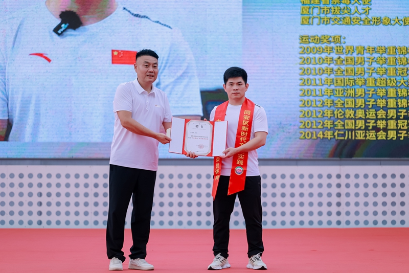 活動現場,來自同安的奧運舉重冠軍林清峰被聘任為同安區新時代文明實踐“中央廚房”項目榮譽講師。