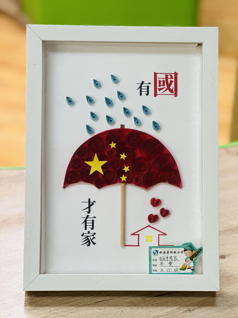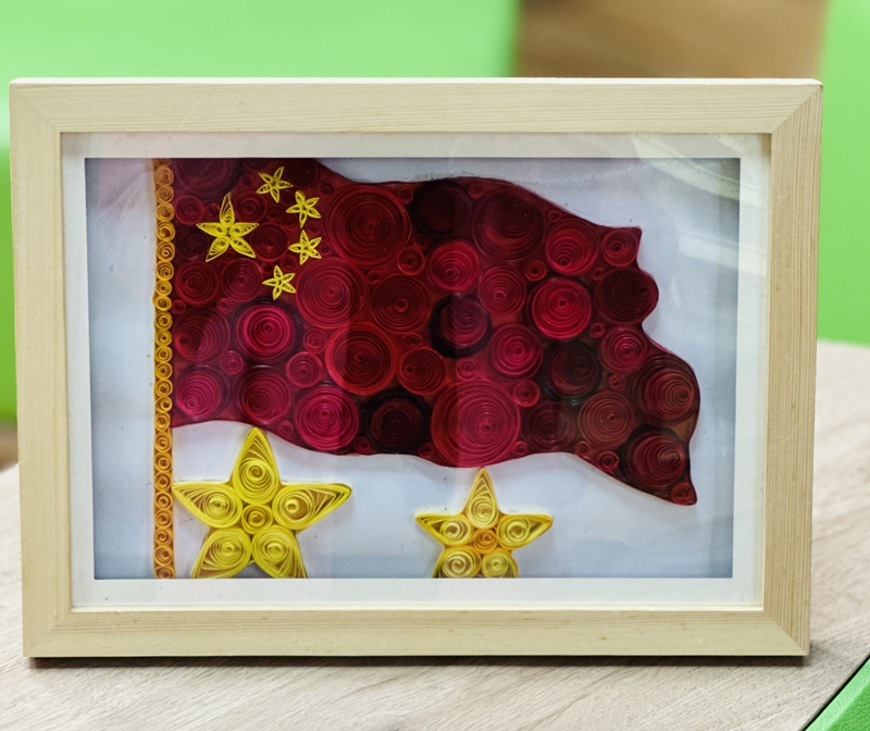 在衍紙工坊,一幅紅色的“中國地圖”衍紙畫頗為搶眼,這幅衍紙畫以一個個紅色卷紙筒拼出中國地圖的輪廓,又以一個個黃色卷紙筒拼出“中國”二字鑲嵌其中,畫面立體、穩(wěn)重、大氣。衍紙畫,又稱卷紙畫,就是把一張張平面彩帶卷成一個個立體“零件”,再把一個個立體“零件”拼裝成一束花、一張畫、一幅地圖……在松航小學(xué)衍紙工坊,孩子們不僅能接觸到衍紙藝術(shù),還能深入了解竹編技藝。
