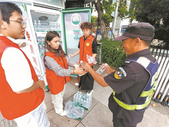 送出一瓶水,清涼一座城。2024年泉州市“我為群眾辦實事”文明實踐活動暨市直機關“志愿情·黨旗紅”志愿服務活動——“愛心冰柜免費奉水 關愛高溫下勞動者”活動自7月1日啟動以來,設置在市區多條街道的11個愛心冰柜服務點和若干奉茶點“堅守崗位”,為環衛工、快遞員、公交司機、交警等一線勞動者免費提供礦泉水等冷飲。