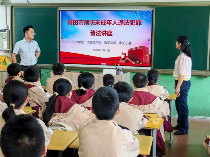 當天上午,莆田市委文明辦、市司法局、市關(guān)工委在該校六年級教室舉行“遠離犯罪,筑牢青春防線”預防青少年犯罪專題講座。福建謹一律師事務所劉心洋律師圍繞犯罪和我們有什么關(guān)系、未成年犯罪的發(fā)展軌跡、未成年常見的犯罪行為、如何預防未成年犯罪、犯罪對自己一生的影響等5個方面進行深入淺出的闡述,并以案釋法,提高學生們的法治意識,為青少年陽光成長提供法治保障。
