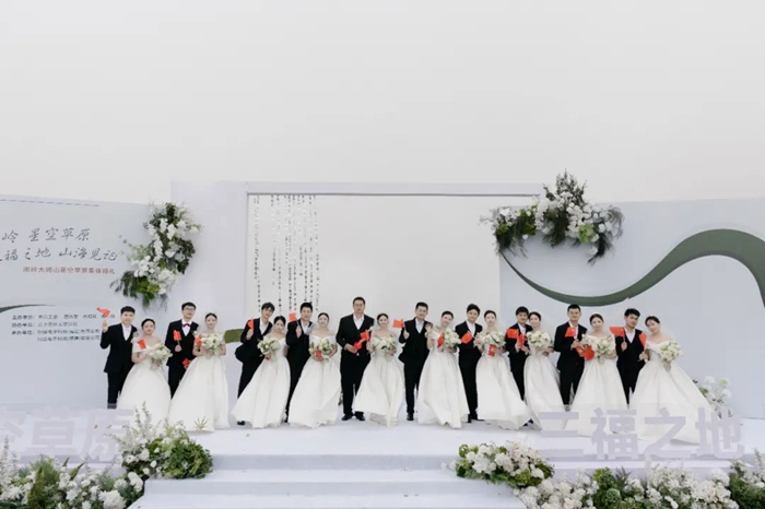 廣袤的草原生機勃勃,藍色的天空觸手可及,甜蜜的旋律悠揚流淌,簡約的裝飾賞心悅目,精心布置的南嶺大姆山草場一派喜慶,處處是美好風光。10對新人身著禮服,在領導嘉賓、親朋好友、公司同事的見證和祝福下,宣讀結婚誓詞,交換戒指,聯合發起移風易俗倡議,帶頭倡導為真愛“降壓”,為美滿“增值”。