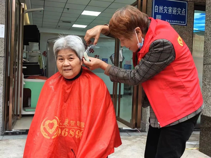 福隆社區(qū)新時代文明實踐站志愿者正在為居民剪頭發(fā)。