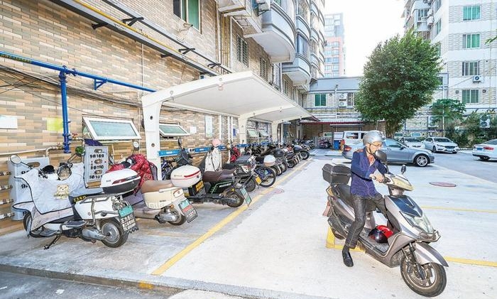 改造后的金利花苑小區(qū),電動摩托車停放充電區(qū)井然有序。董嚴(yán)軍 攝