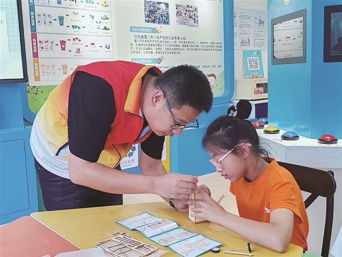 筼筜街道安全教育館工作人員指導(dǎo)孩子們制作垃圾分類桶。
