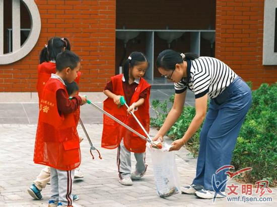 小志愿者認真撿拾煙頭(翔安區委文明辦供圖)