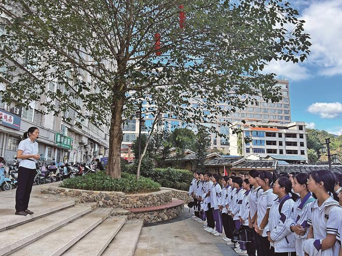 志愿者宣講員黃秀鳳帶大田一中學(xué)生參觀“第二集美學(xué)村”舊址。