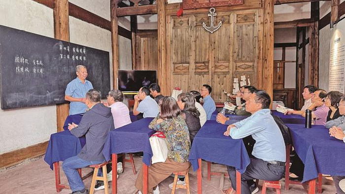 “因抗戰(zhàn)爆發(fā),廈門失陷,1939年,集美職業(yè)聯(lián)合學(xué)校下轄的水產(chǎn)航海、商業(yè)、農(nóng)林等三所中專學(xué)校14個(gè)班614名師生遷到大田縣辦學(xué)……”11月13日,在大田“第二集美學(xué)村”舊址,志愿者宣講員、大田鴻圖中學(xué)老師范建洪為永春教育系統(tǒng)的老師們講解集美職校內(nèi)遷歷史。