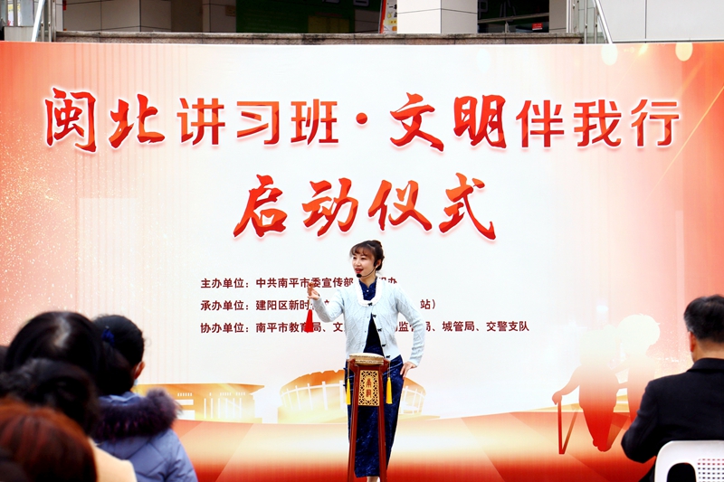 2024年3月6日,由南平市委宣傳部、市委文明辦主辦的“閩北講習班·文明伴我行”文明講習班啟動儀式上,中國文藝志愿者協會第三屆“時代風尚”學雷鋒最美文藝志愿者的李文娟老師通過非遺南詞表演,倡導群眾不當不講文明的“混不吝”,爭當文明標兵。鄭正華 攝