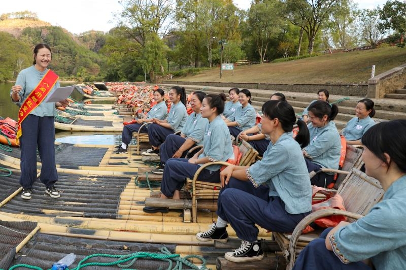 九曲溪上,閩北講習班·溪言習語”宣講隊隊員、竹筏工陳佳在給講習班成員們講述宣講經驗。 武夷山市融媒體中心供圖
