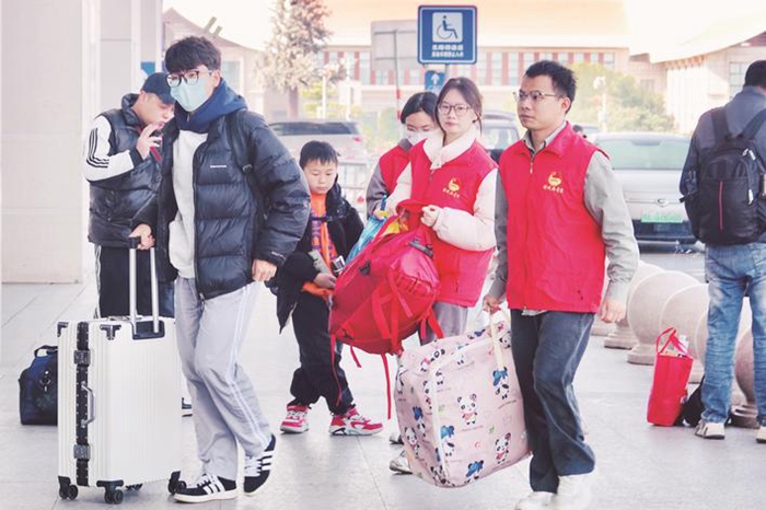 “您好,我來幫您一起搬吧。”車站前,青年志愿者穿行在過往旅客中,主動幫助旅客搬運行李,耐心提供引導(dǎo)服務(wù),協(xié)助維護現(xiàn)場秩序,用行動和笑容,為返鄉(xiāng)之路更添一抹溫暖。“過往旅客的每一次微笑、每一聲感謝都是對我最大的鼓勵。新的一年,能夠發(fā)揮我微薄的力量為家鄉(xiāng)的春運作貢獻,我覺得非常光榮,也充滿了幸福。”漳籍返鄉(xiāng)大學(xué)生、來自中南民族大學(xué)的志愿者陳章涵說道。